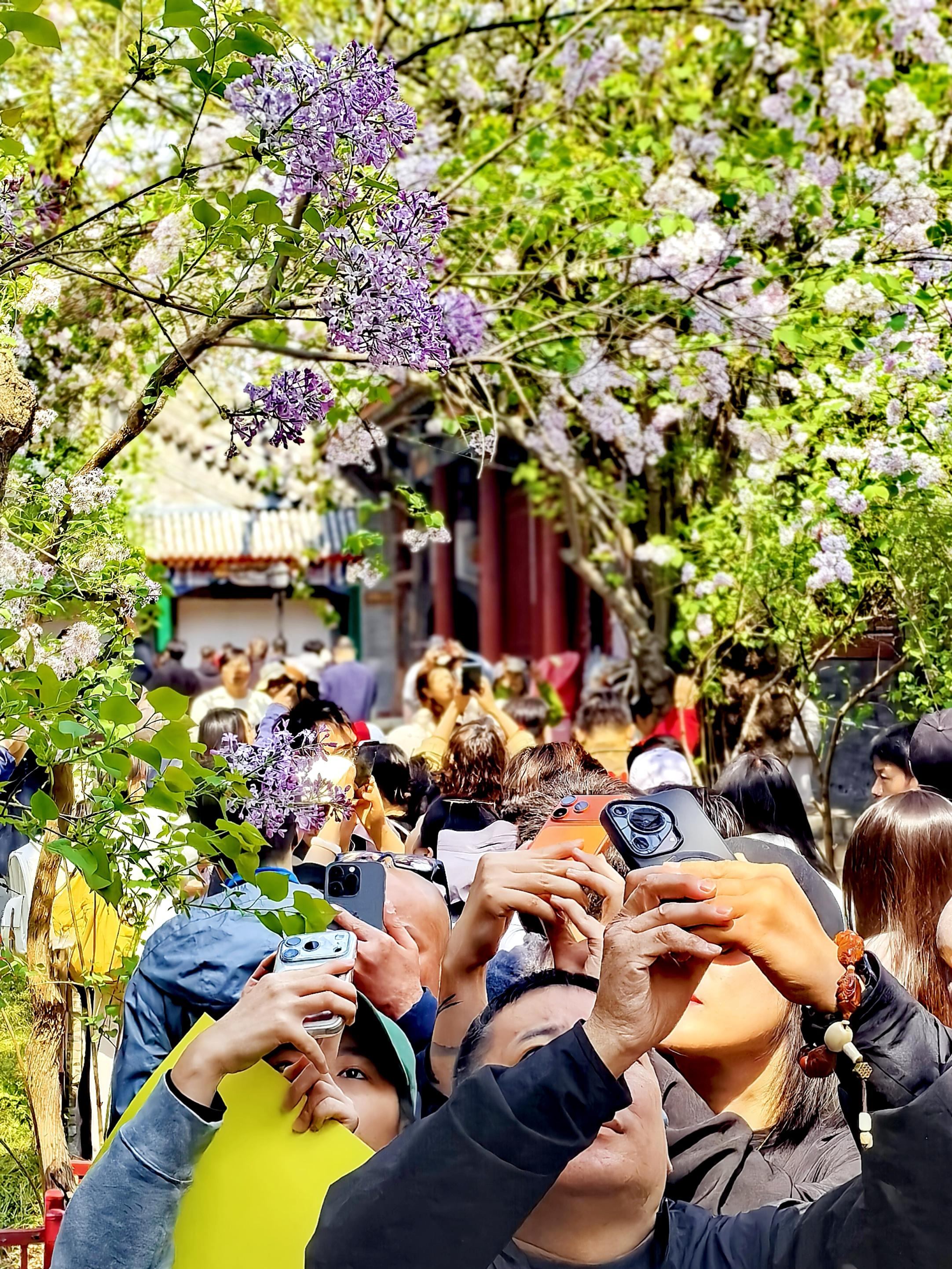 今天是清明节假期首日,到北京法源寺踏青观赏丁香花的游人络绎不绝。