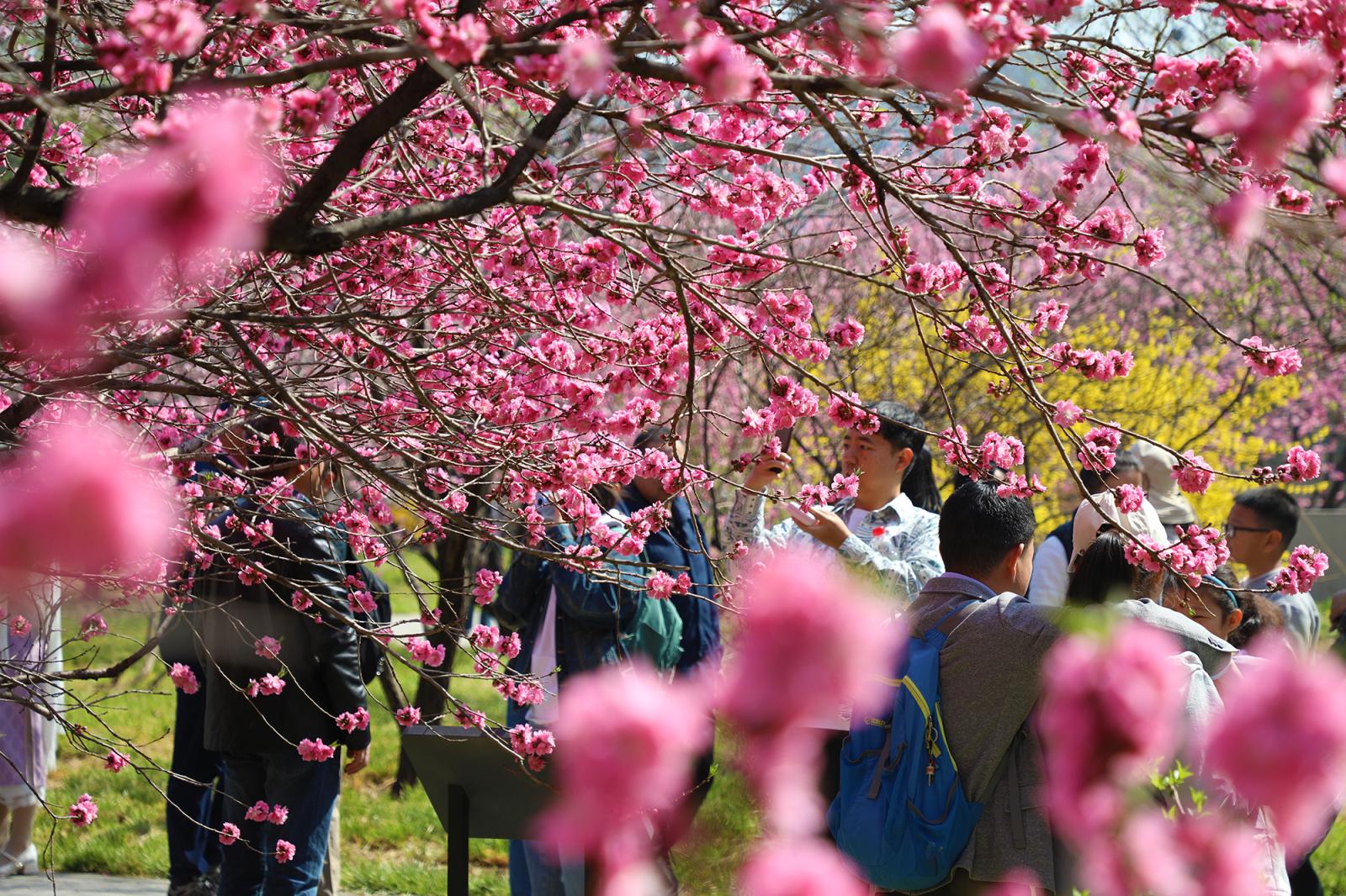 在园区科普馆西侧的桃花大道,国家植物园(北园)拥有自主知识产权的品虹桃和品霞桃迎风盛放,粉艳的花团缀满枝头,与高大素白的白花山碧桃相间而生,万千繁花层层叠叠铺满枝头,深浅相映、美不胜收,更有明亮鲜艳的郁金香点缀其间,辅以远处的层峦叠起的青山,勾勒出一幅芳菲四溢的春日盛景,让每一位游人沉醉其中,流连忘返。