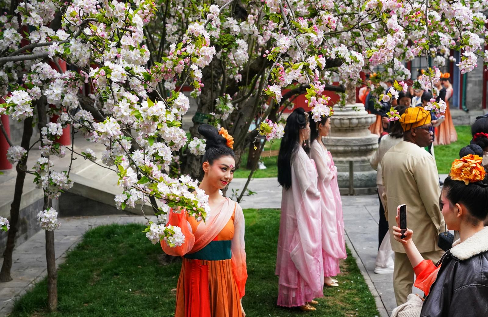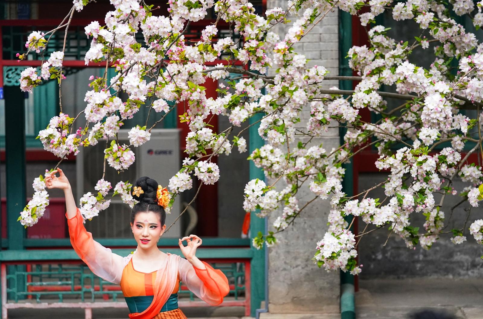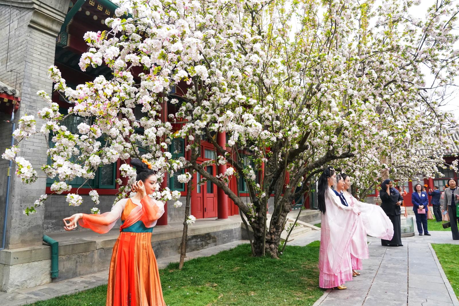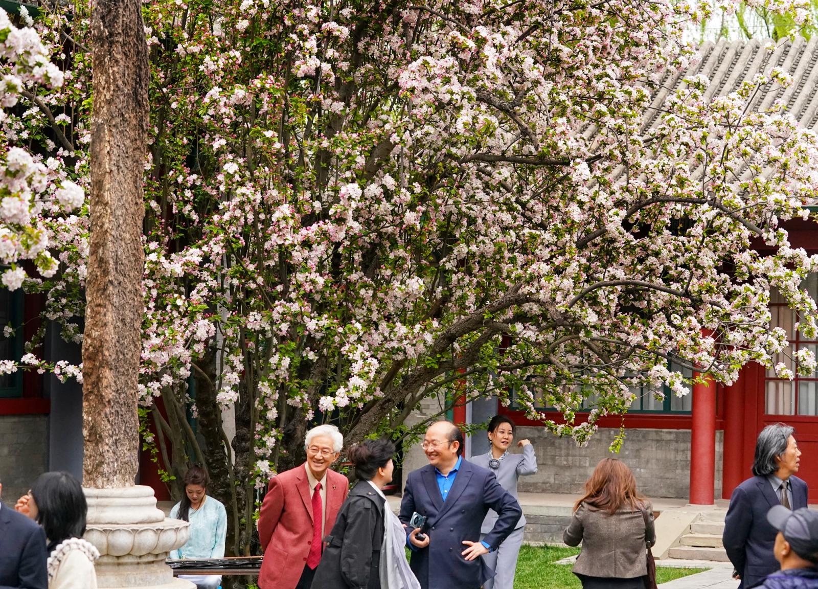 近日,北京宋庆龄故居内两株逾200年树龄的西府海棠进入盛花期,粉白繁花缀满枝头,性做久久久久久久如云似雪映朱红古建,成为春日京城一抹动人景致,吸引大批中外游客慕名前来打卡、驻足赏春。