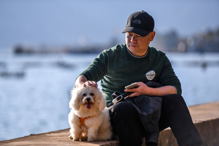 自驾来昆明的游客带着宠物狗在滇池畔赏鸥(2月3日摄)。新华社记者 彭奕凯 摄